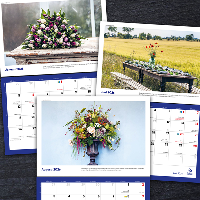 Köp vår väggkalender, framtagen i samarbete med den folkkära floristen Karl Fredrik Gustafsson. Samtliga motiv är hämtade från hans bok Mitt blomsterår på Österlen. Allt överskott från kalendern går till vårt livsviktiga arbete.
